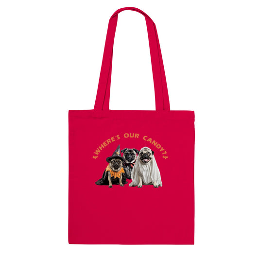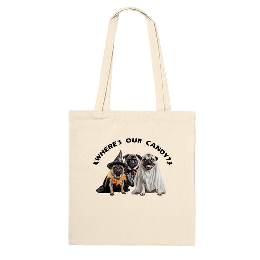 Where's our candy? Black lettering -- Classic Pug Halloween Tote Bag