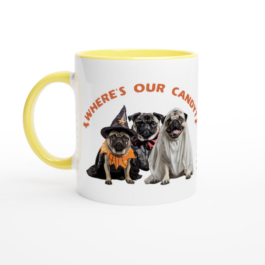 Where's our candy? -- White 11oz Ceramic Halloween Pug Mug with Color Inside